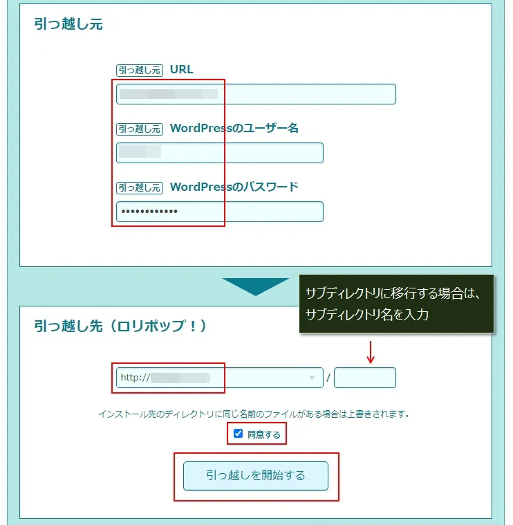 このツールで、ブログのURL、WordPressのログインアカウント(ユーザー名パスワード)を入力だけで引っ越しできるんです。