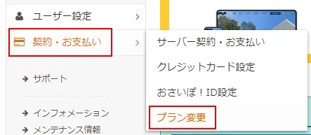 ロリポップのユーザー専用ページにログインして、「契約・お支払い」メニューの「プラン変更」を選択。