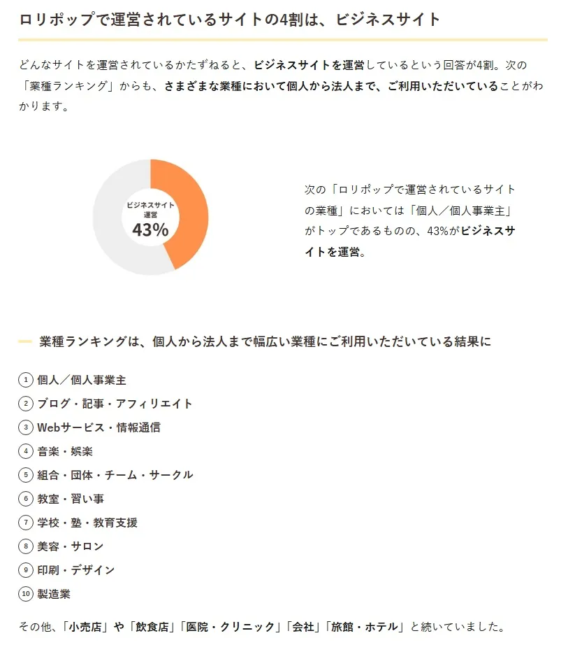ロリポップでは、「ホームページ制作事業者」向けとそれ以外(貴人、個人事業主、中小企業など)の2種類に分けてアンケートを取ったようです。