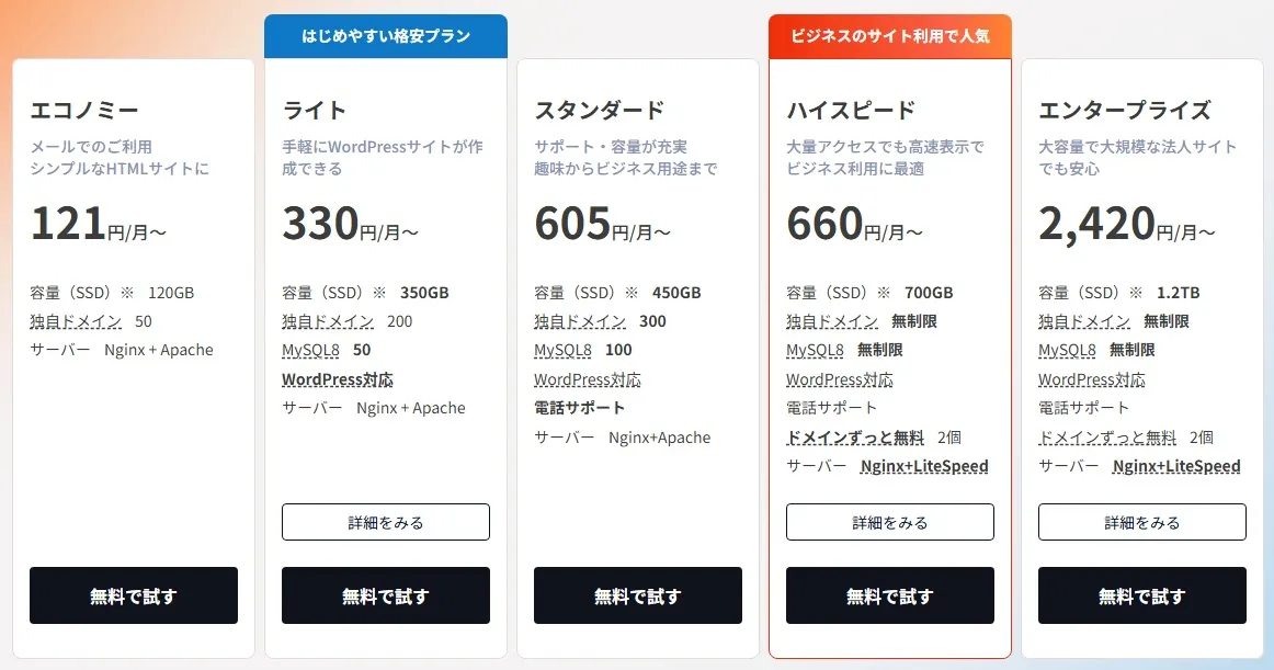 スペックは高いのに、料金はスタンダードプランよりほんの少し高いだけなので、長く運営したいのであれば、断然ハイスピードプランがおすすめです。