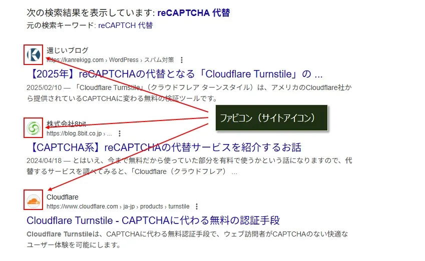 サイトアイコンを設定しておくと、Googleの検索で表示され記事の中から、そのサイトの記事だということが簡単に識別できます。