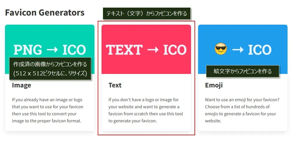 ここでは、テキストからファビコンを作成する方法、絵文字からファビコンを作成する方法を中心に紹介します。