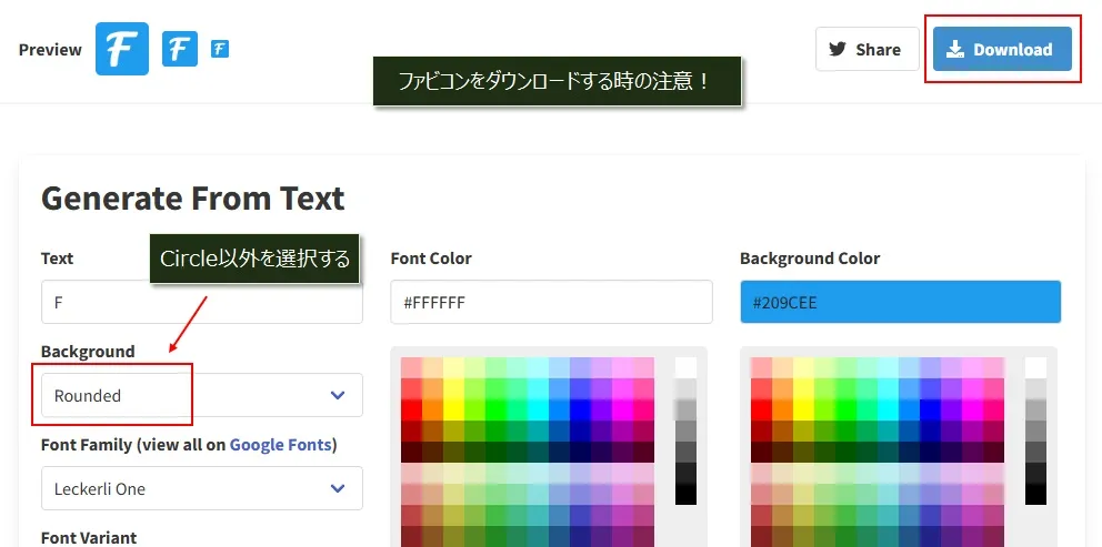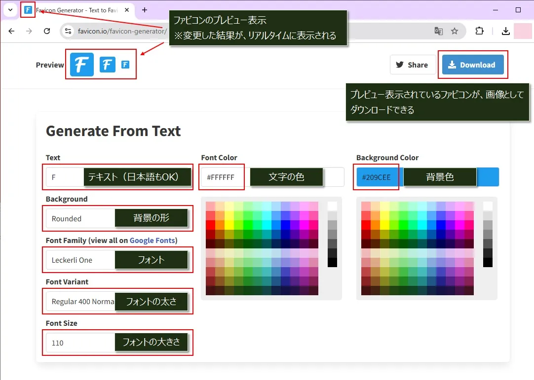 「Generate From Text」内の赤枠部分を変更して、ファビコンを作成します。