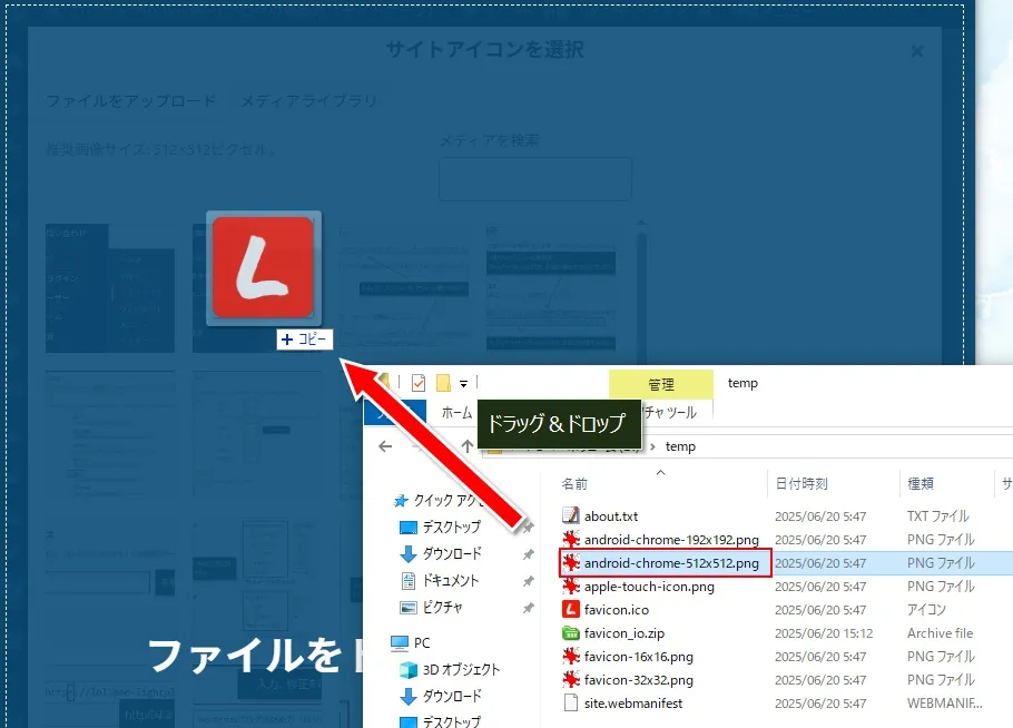 ファビコンの画像をドラッグ&ドロップします。