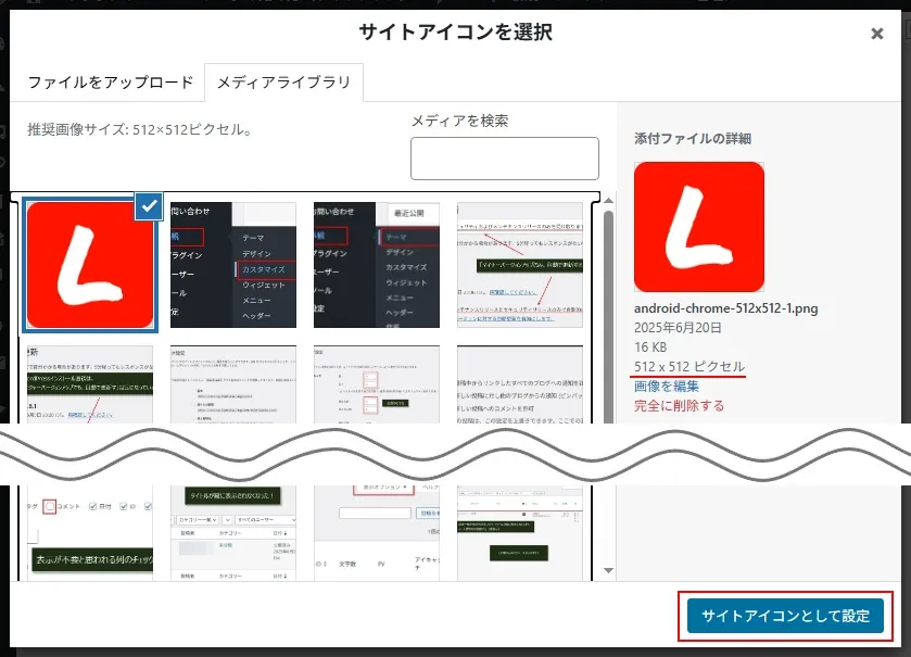 WordPressのファビコンの画像サイズは、縦、横とも最低512ピクセル以上が推奨となっています。