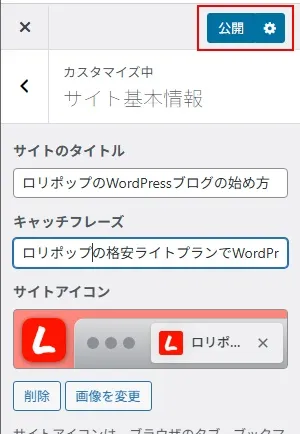 最後に、「公開」をクリックすれば、カスタマイザーでのファビコンの設定が完了です。