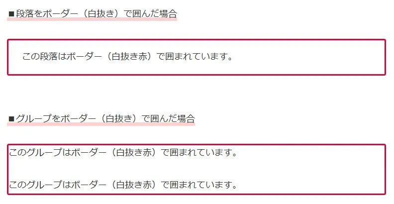 グループを囲むスタイル(ボーダー)には以下のものがありますが、なぜか白抜き(赤枠部分)だけがパディングが0になるので、注意してください。