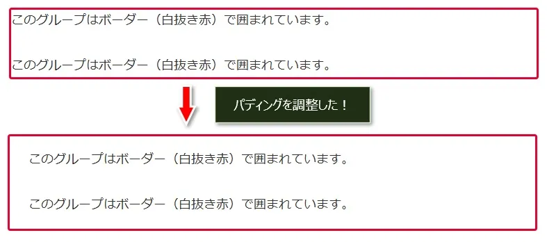 そこで、グループの時でも段落を囲んだ時と同じパディングになるように、以下のCSSを追加。