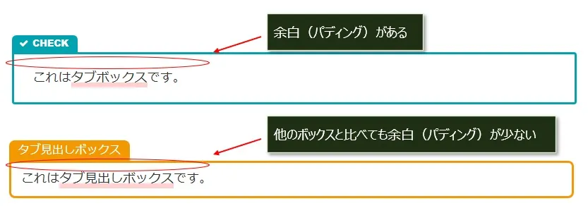 見出しボックス、タブ見出しボックス、ラベルボックスは、「ボックスブロック」で解説しているように内部余白(パディング)が少ないので、パディング調整のCSSも追加してください。
