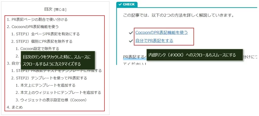 Cocoonでは目次のリンクやID指定の内部リンクをクリックすると、H2やH3などの見出しにジャンプ(スクロール)することができます。(他のテーマも同様です)