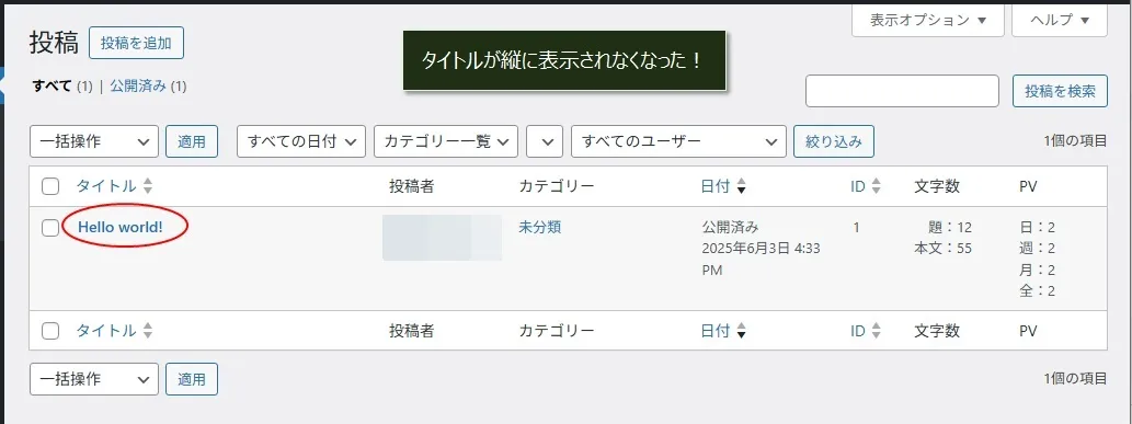 Cocoonの投稿一覧画面は表示列が多いために、以下のように記事のタイトルが縦長に表示されて非常に見づらくなります。
