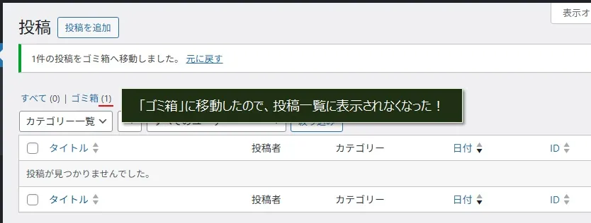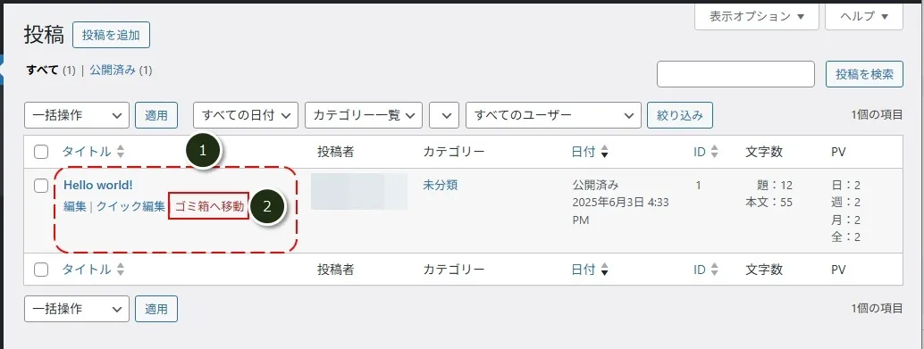 サンプル投稿「Hello world!」のタイトル列の上にカーソルを置いて、表示されるメニューの「ゴミ箱へ移動」をクリック。