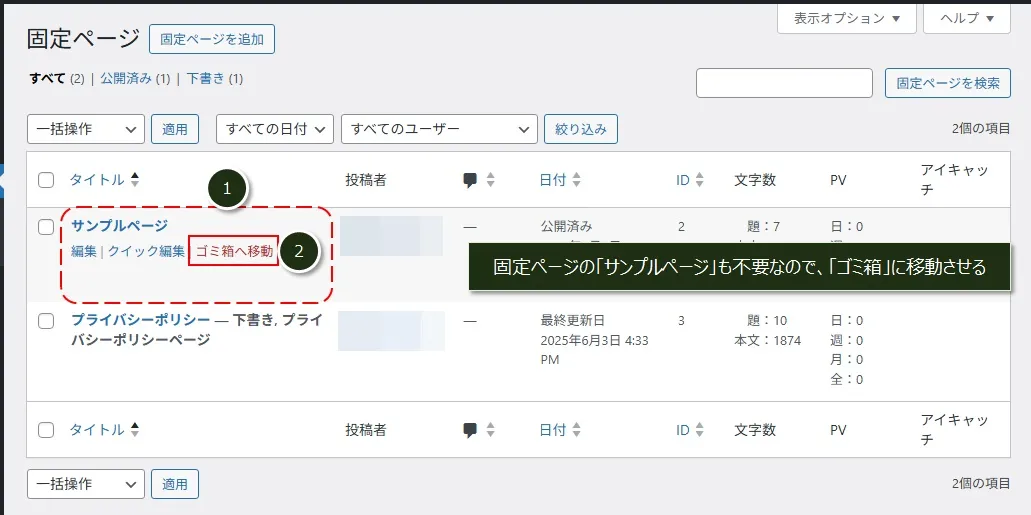 これで、固定ページの「サンプルページ」もゴミ箱に移動します。