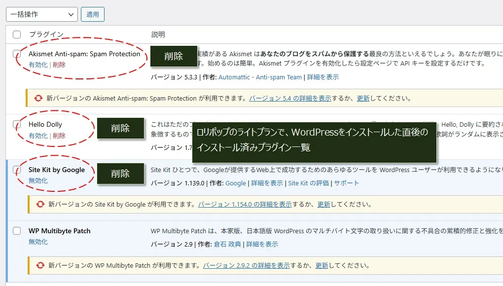ロリポップでWordPressをインストールすると、、不要なプラグインがいくつか自動でインストールされるので削除します。