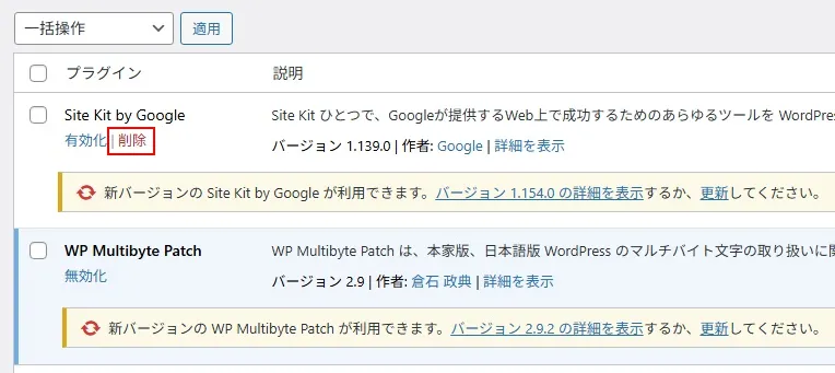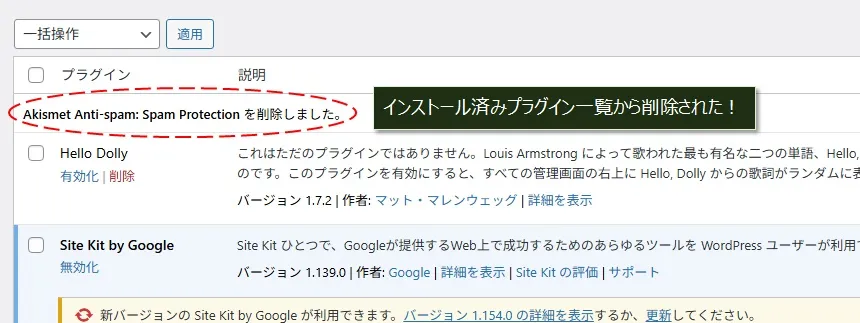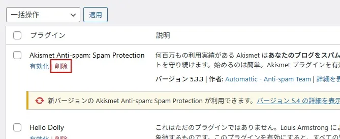 同様に、プラグイン「Hello Dolly」も同じ手順で削除してください。