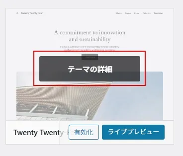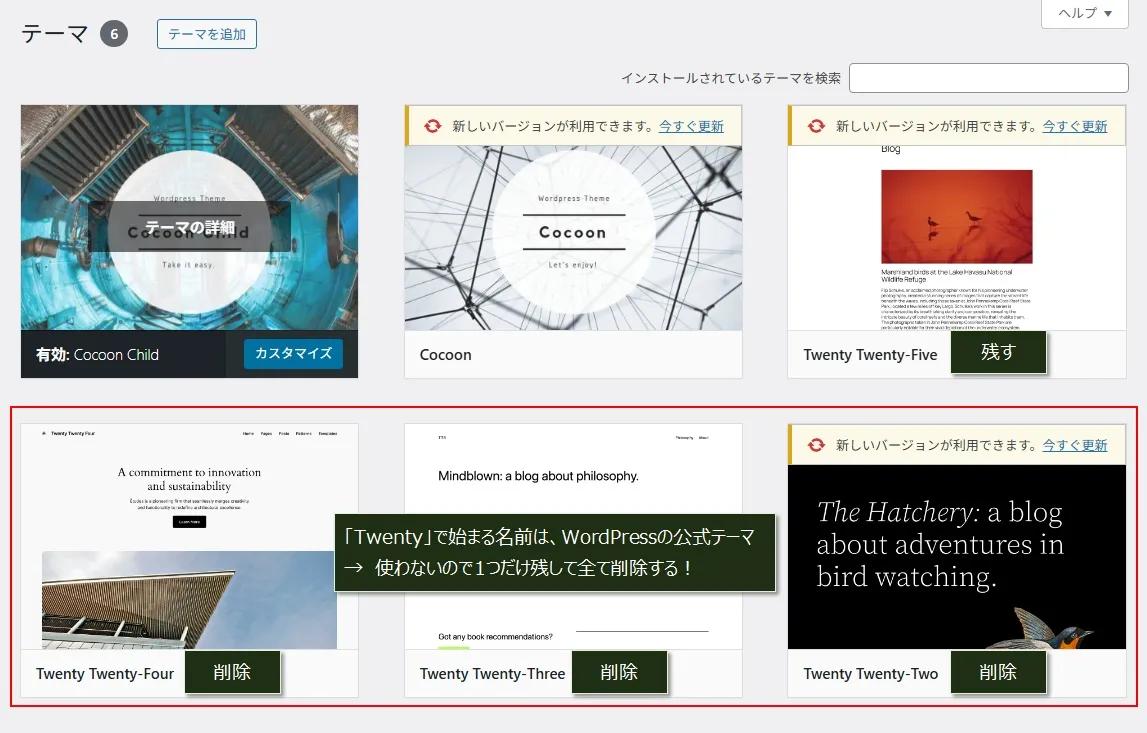 赤枠のテーマが削除するWordPressの公式テーマです。(公式テーマは1つだけ残す)