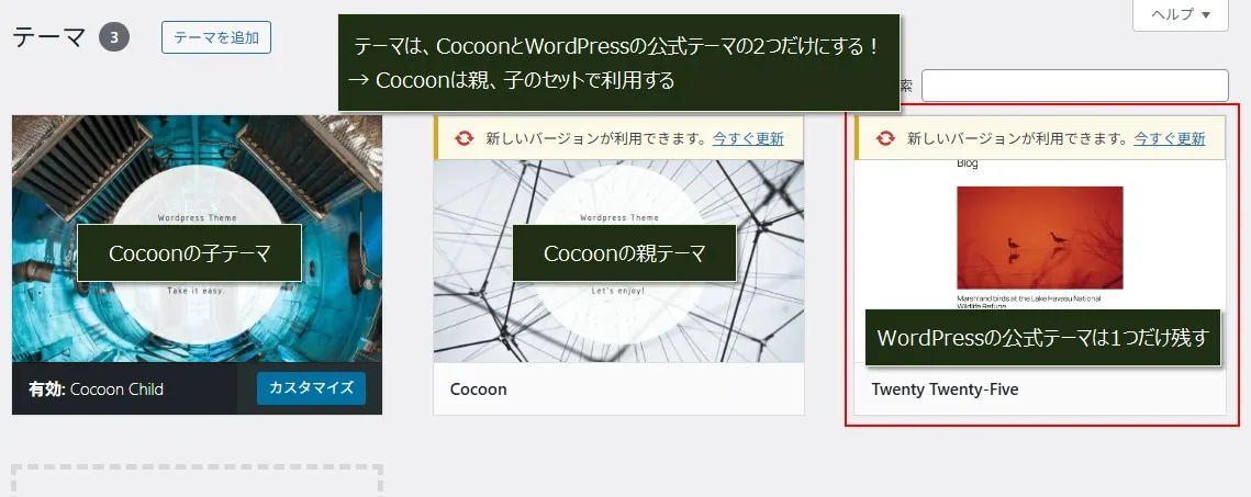 不要なテーマを削除すると、以下のようにCocoon(親、子のセット)と、WordPress公式テーマだけになります。