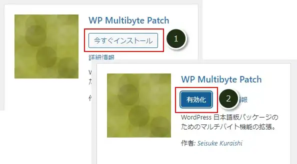 「WP Multibyte Patch」が検索されたら、「今すぐインストール」(①)→「有効化」(②)とクリックします。
