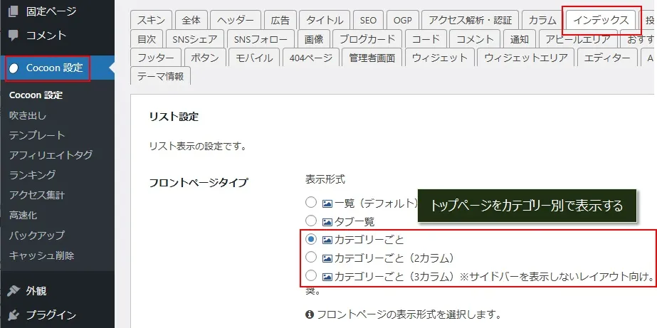 これから紹介する方法は、以下の「カテゴリーごと」を選択したフロントタイプページを対象としてします。