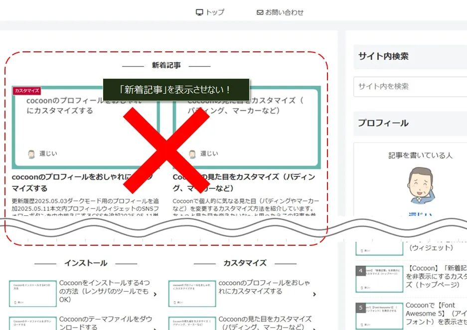 これで、トップページの先頭に表示されていた「新着記事」を消すことができます。