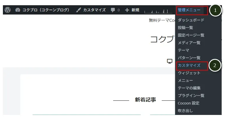 管理ツールバーの「管理メニュー」(①)→「カスタマイズ」とクリック。