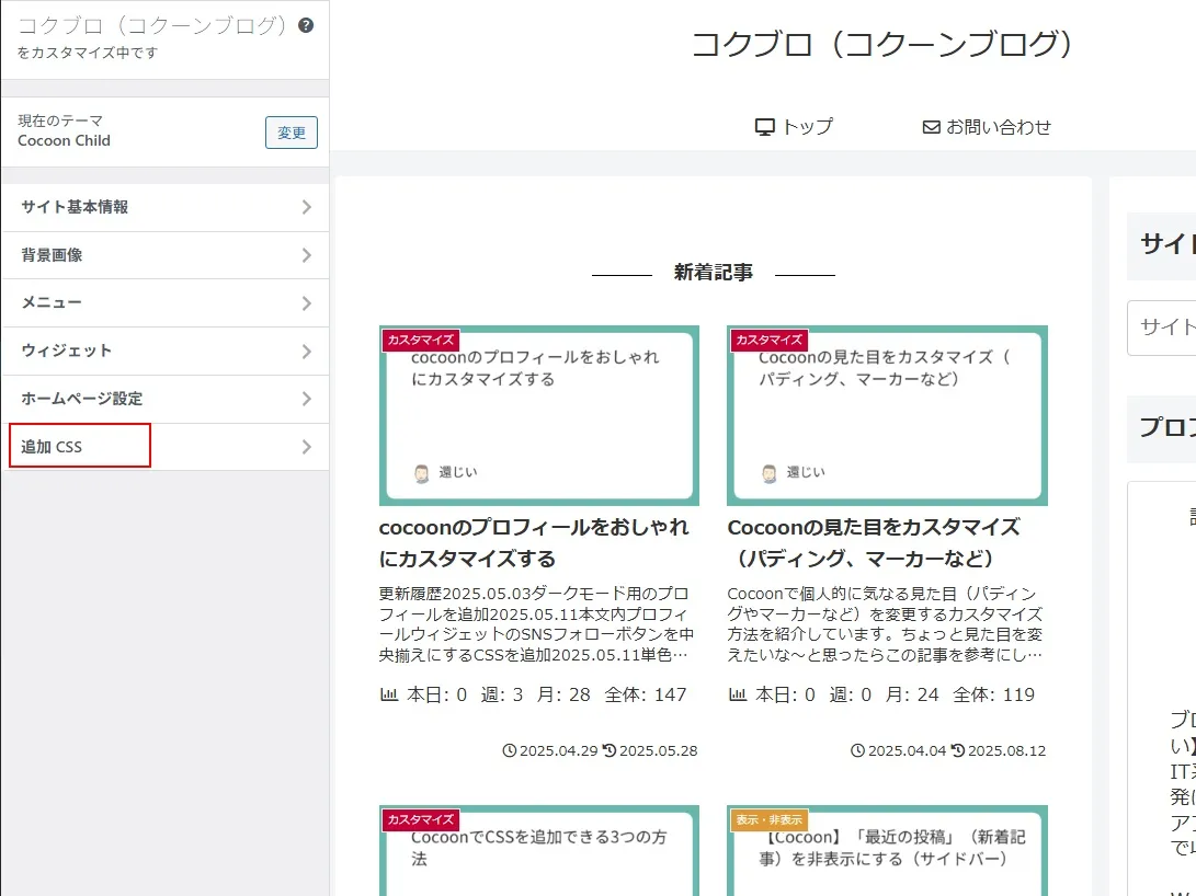 CSSを追加することで「新着記事」を非表示にしますが、CSSの追加はカスタマイザーを利用します。