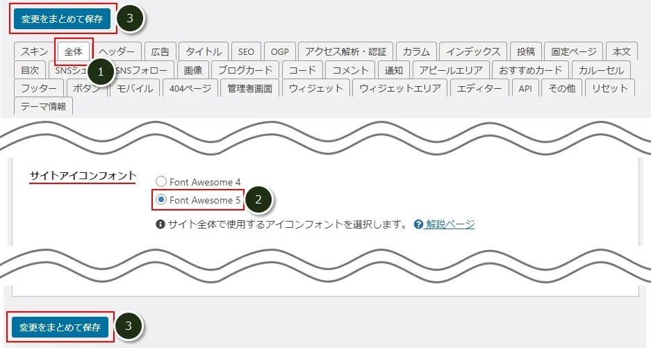 「全体」タブ(①)をクリックし、「サイトアイコンフォント」で「Font Awesome 5」を選択して、画面上か下にある「変更をまとめて保存」(③)をクリック。