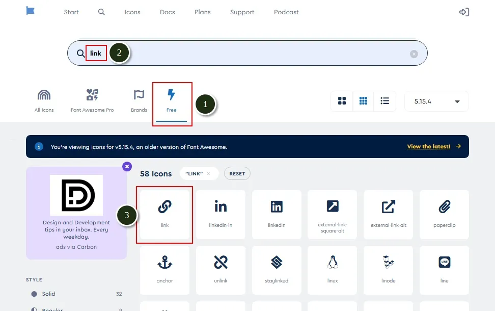「Free」(①)をクリックし、検索するアイコン名などを入力(ここではlink)(②)すると自動で検索されます。