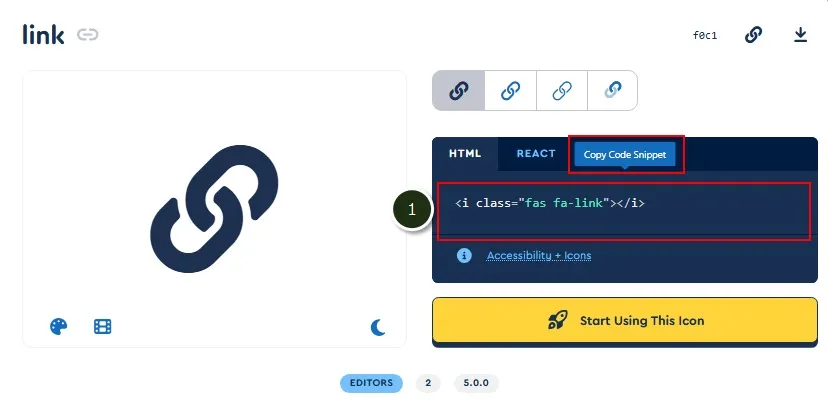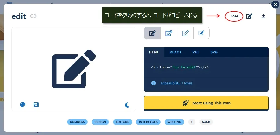 見つかったら、アイコンフォントの表示用のHTMLコードをコピーして、メモ帳などに保存してください。