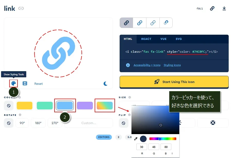 アイコンフォントの画面で、左下にある「Show Styling Tools」のアイコン(①)をクリックすると、色がいくつか表示されます。