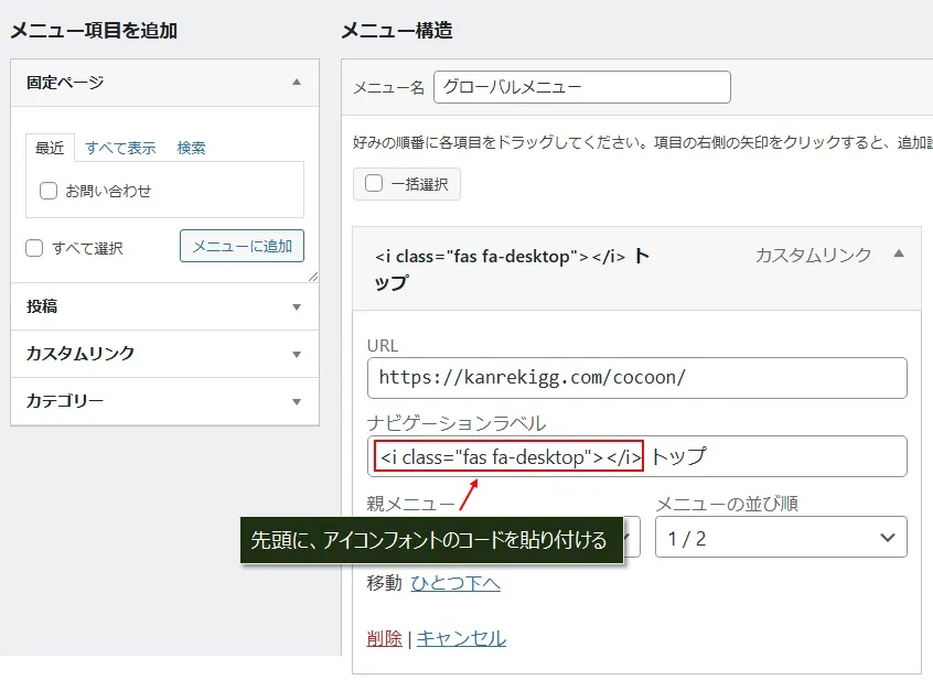 ナビゲーションラベル(ここでは「トップ」)の前に、アイコンフォントのHTMLコードを貼り付けて、画面下にある「メニューを保存」をクリック。