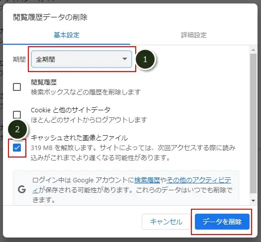 以下①~②を入力し、「データを削除」をクリック。