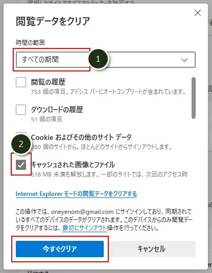 以下①~②を入力し、「今すぐクリア」をクリック。