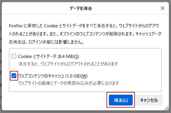 これでFirefoxのキャッシュがクリアされます。