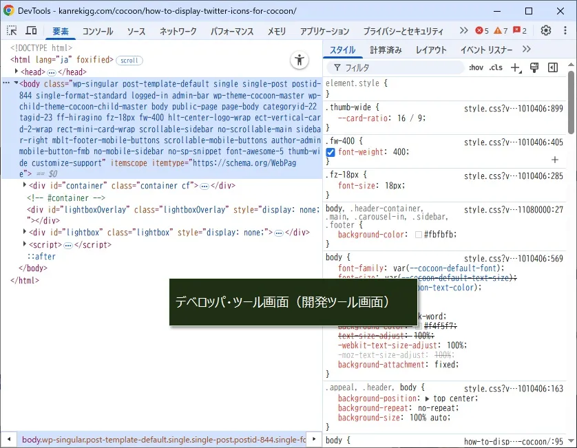 先日、Cocoonをバージョンアップしたら、下の画像のように大きい方の「X」のロゴ(Webフォント)が表示されない現象が発生しました。