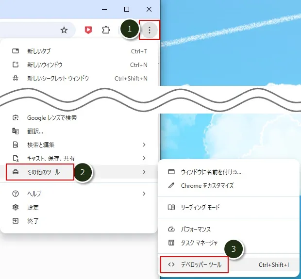 右上の「3点リーダーアイコン」→「その他のツール」→「開発者ツール」をクリック。