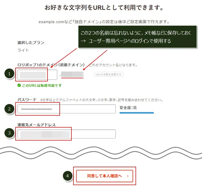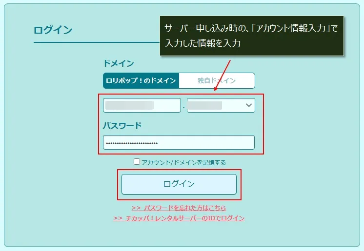 ロリポップの「ユーザー専用ページ」にログインするためのアカウント情報を入力します。