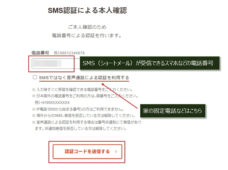 ※ショートメールが使えない場合は、家の固定電話でもOKです。(音声で認証コードを確認)
