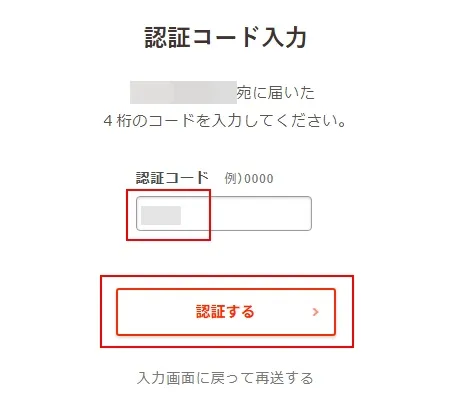 ショートメールに書かれている認証コードを入力して、「認証する」をクリック。