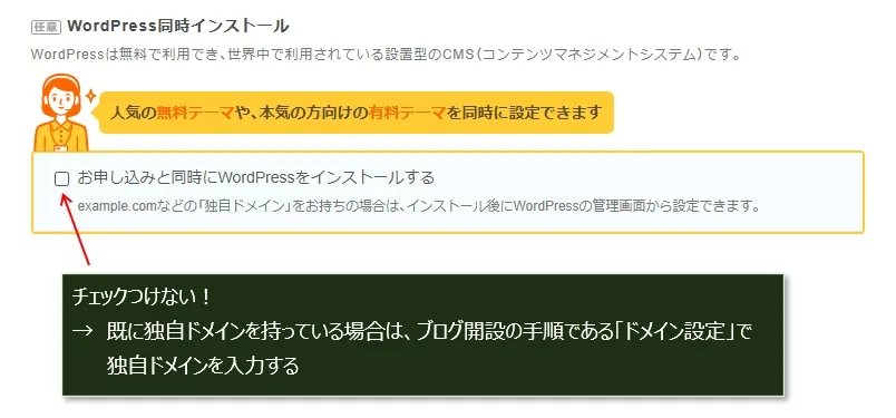 既に独自ドメインを持っている場合でも、「お申込みと同時にWordPressをインストールする」にはチェックをつけません。