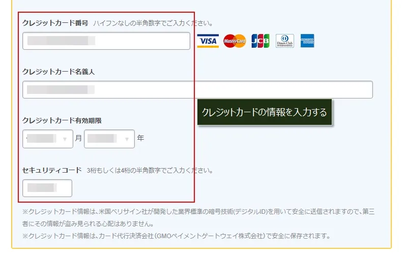 クレジットカードを利用する場合は、カードの情報を入力します。