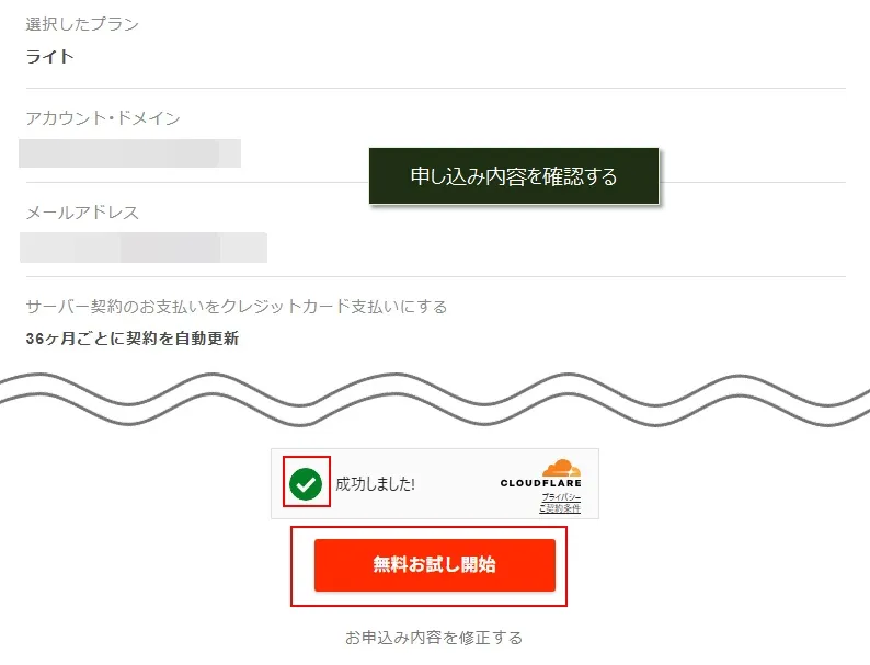 入力した申し込み情報を確認したら、赤枠部分にチェックをつけて、「無料お試し開始」をクリック。