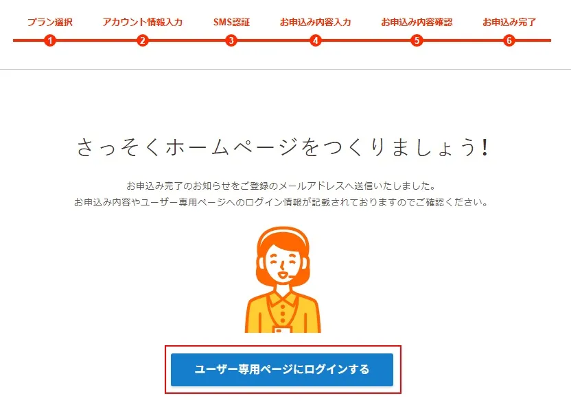 申込みは完了しましたが、さきどの完了画面で「ユーザー専用ページにログインする」を押してみましょう。