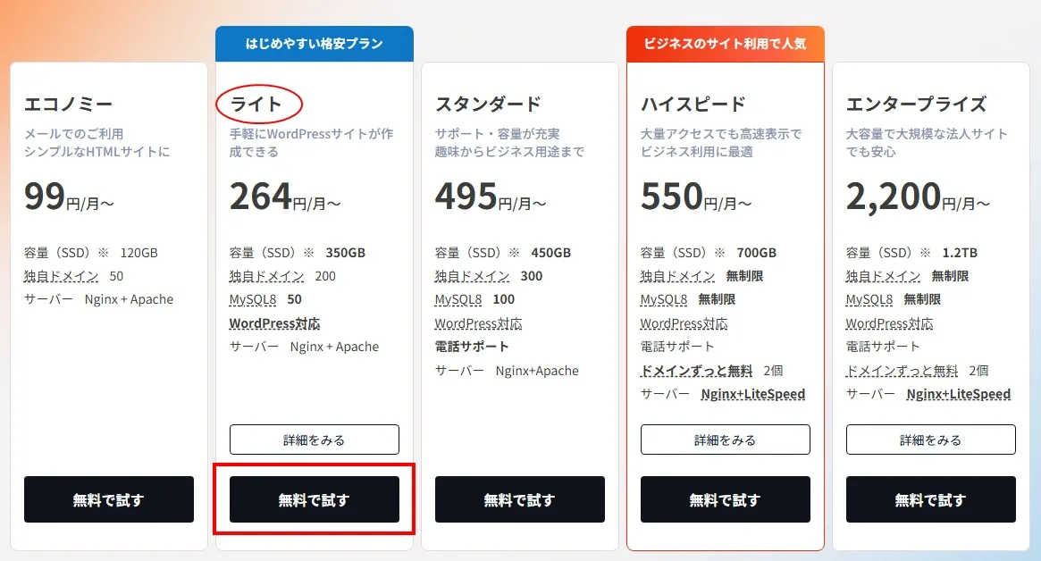ライトプランの「無料で試す」をクリック。