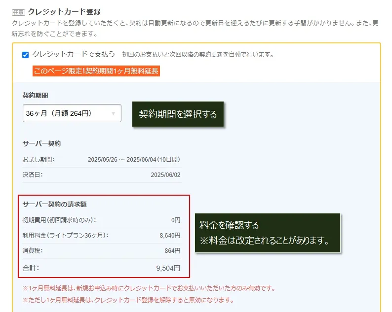 契約期間を選択し、その下の請求額を確認します。