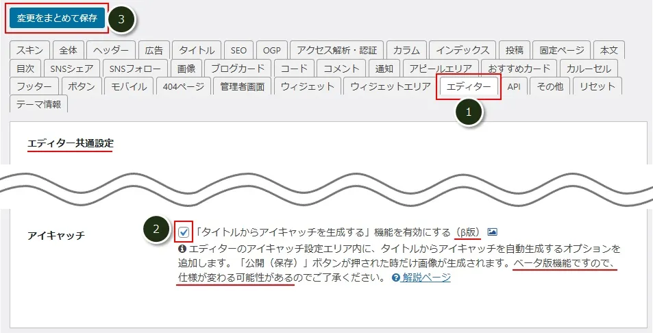 次に、「エディタ共通設定」にある「アイキャッチ」のチェックボックスにチェックをつけて、「変更をまとめて保存」(③)をクリック。