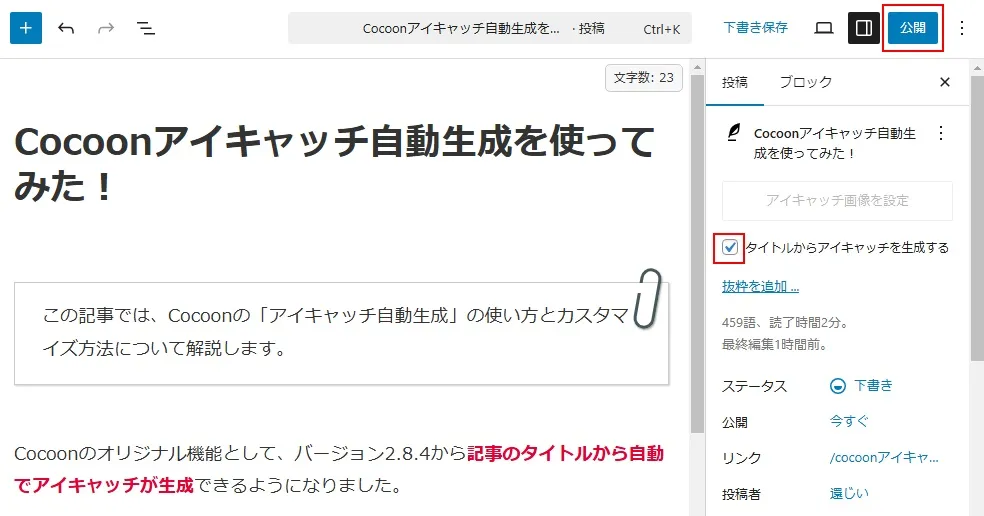 投稿画面で、右の「投稿」タブにある「タイトルからアイキャッチを生成する」にチェックをつけて、「公開」を2回クリックして公開(保存)します。