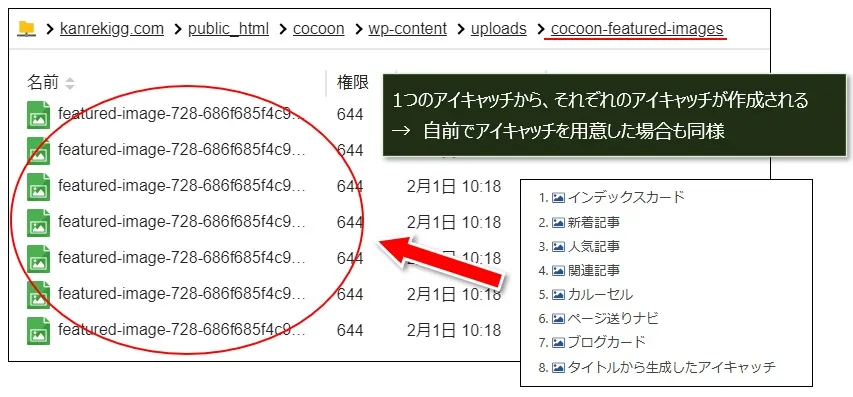 また、アイキャッチ画像はwp-content/uploadsの配下のcocoon-featured-imagesフォルダに格納され、新着記事やカルーセルなどで使われるアイキャッチも作成されます。