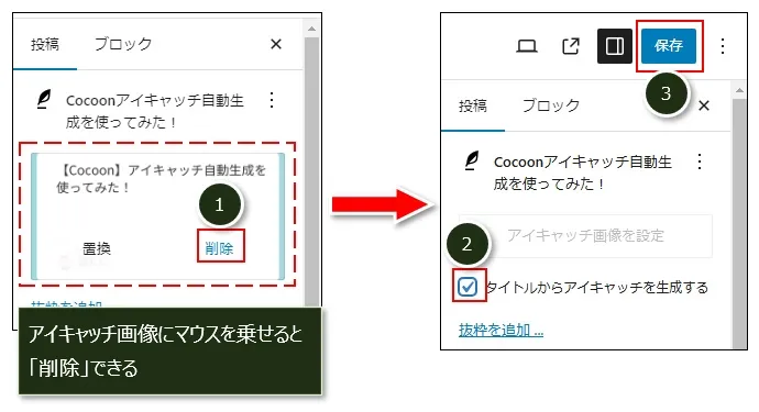 投稿画面の「投稿」タブで、生成済のアイキャッチの上にマウスを乗せて「削除」(①)し、「タイトルからアイキャッチを生成する」にチェックをつけて「保存」(③)をクリック。