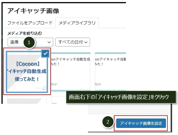 アップロード済のアイキャッチを選択(①)し、画面右下の「アイキャッチ画像を設定」(②)をクリック。